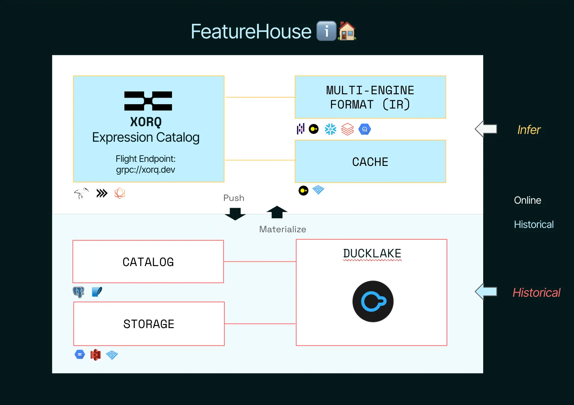 A FeatureHouse built with Xorq, Arrow Flight, and DuckLake gives you: