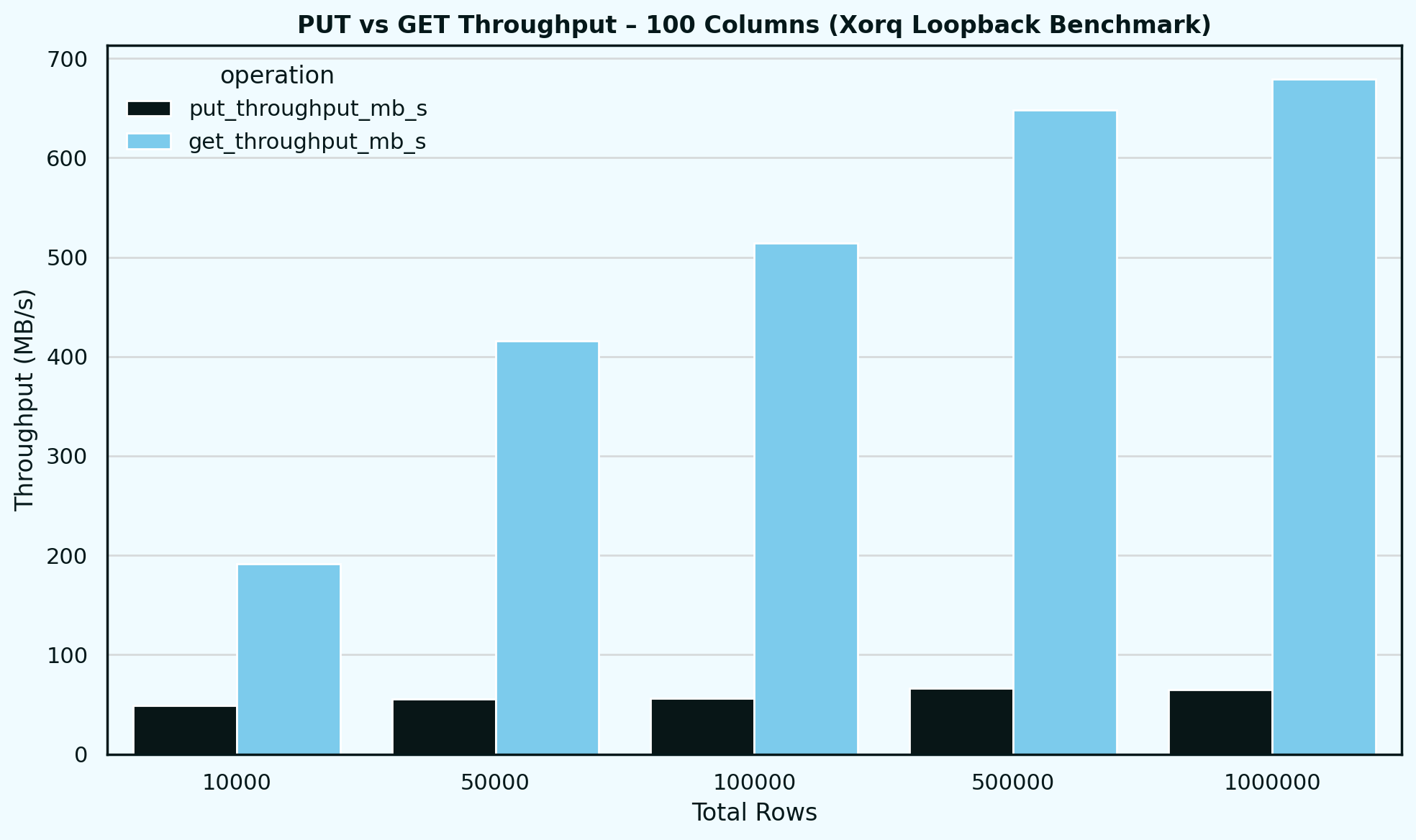 This confirms that our current bottleneck lies not in the transport protocol, but in the storage engine—DuckDB. DuckDB’s lack of support for concurrent writes means that PUT throughput quickly flattens as load increases. In contrast, Arrow Flight is engineered for high-performance parallel data transfer—benchmarks show it can achieve up to 4,800 MB/s for DoPut and 6,000 MB/s for DoGet, utilizing nearly full network bandwidth.