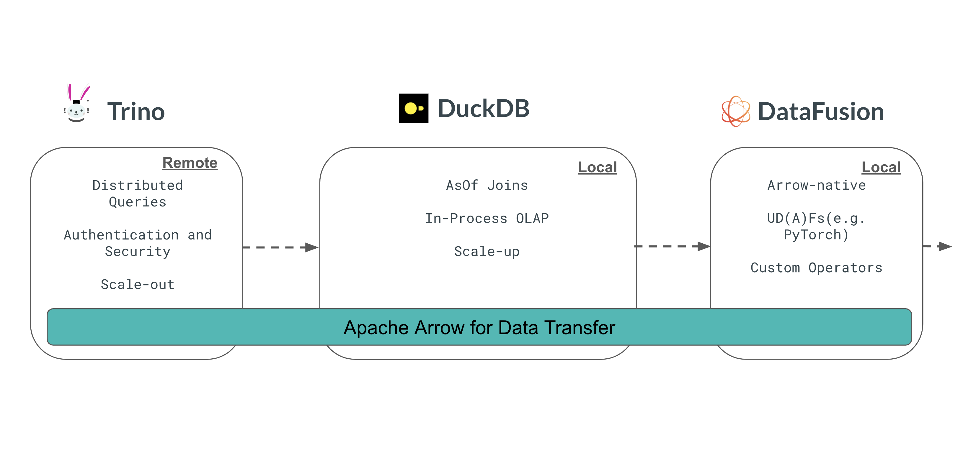 In this blog post we show how to solve this problem in a performant way — without migrating off of Trino — using multi-engine composition. This is in part enabled by Apache Arrow emerging as the de-facto standard for data transfer and in-part enabled by rise of performant in-process engines like DuckDB and DataFusion. All these query engines offer something unique and understanding how to augment your data warehouse capabilities is paramount.