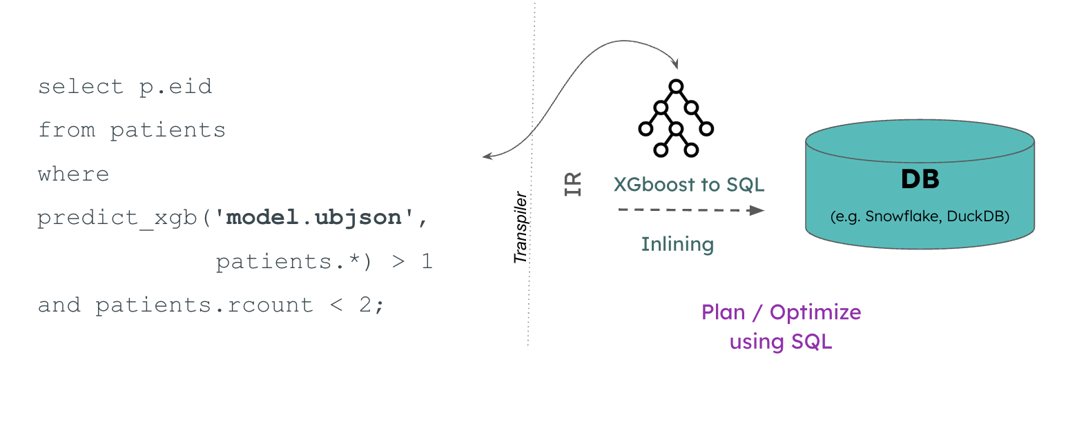 Another challenge is how to do predicate pushdown into the model, since we only required predict_xgb('model.json', patients.*) > 1 we may not need to examine all the trees.